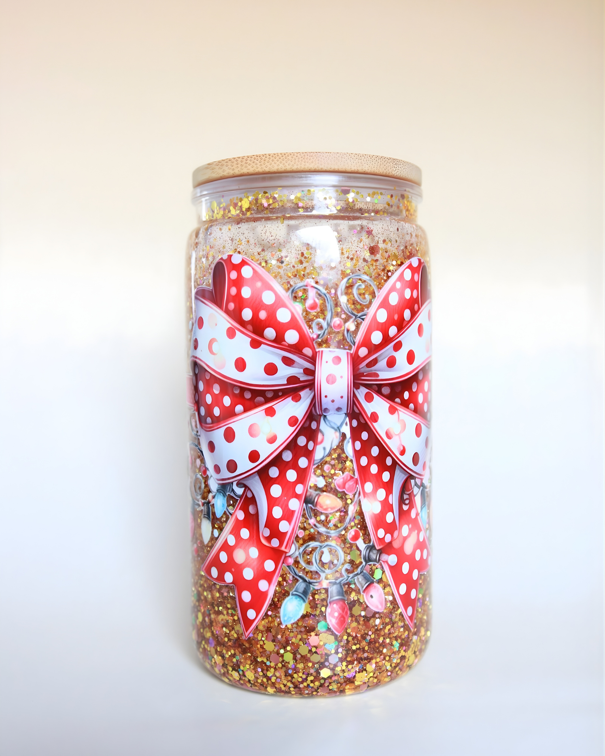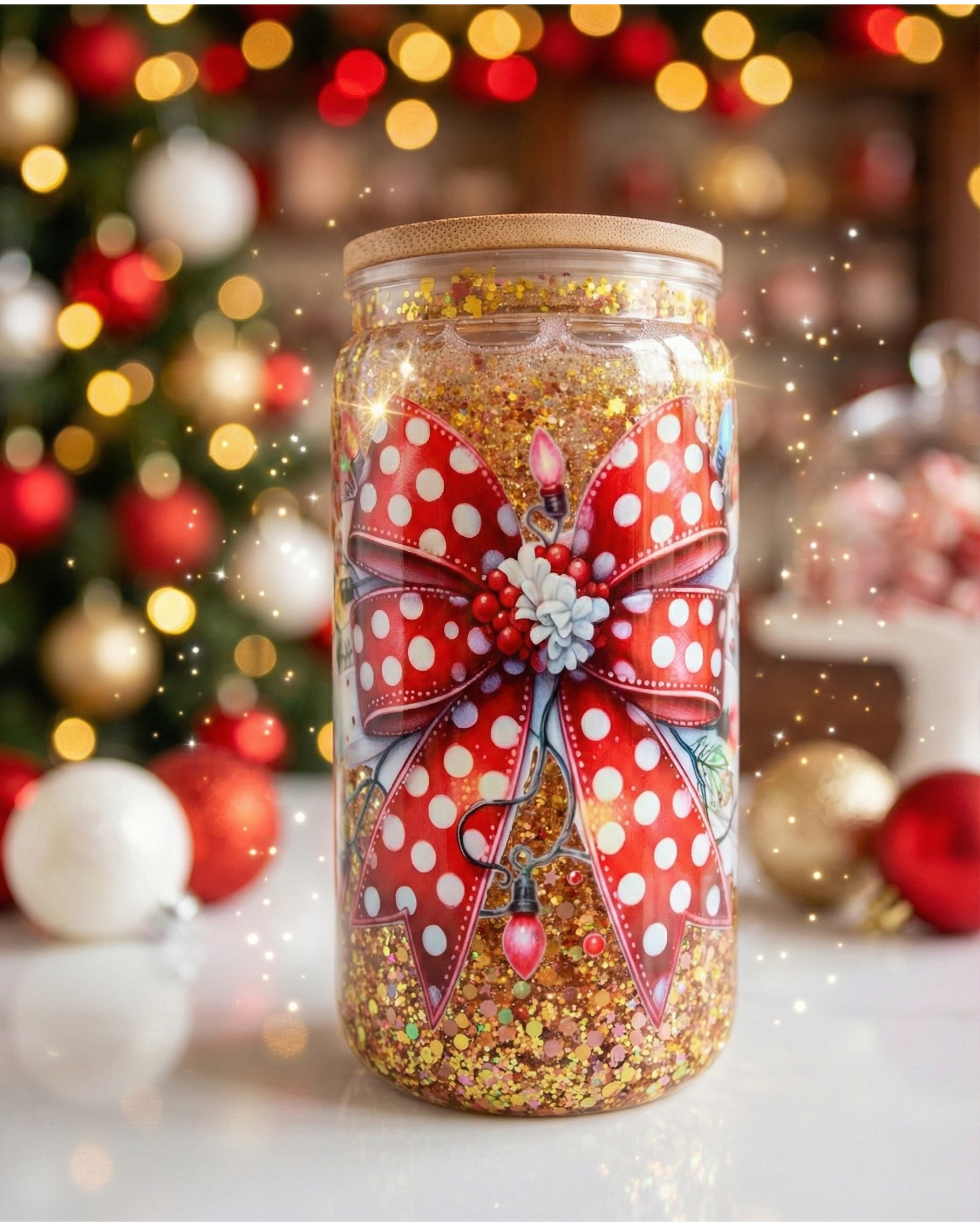 Candy Bow Magic célèbre toute la magie des fêtes avec son immense nœud rouge à pois, digne des plus beaux paquets cadeaux. Ses paillettes dorées, lumineuses et en mouvement, transforment chaque boisson en petit moment enchanté. Avec son couvercle en bambou naturel, il apporte une touche chaleureuse, élégante et résolument magique à ta routine ✨🎄