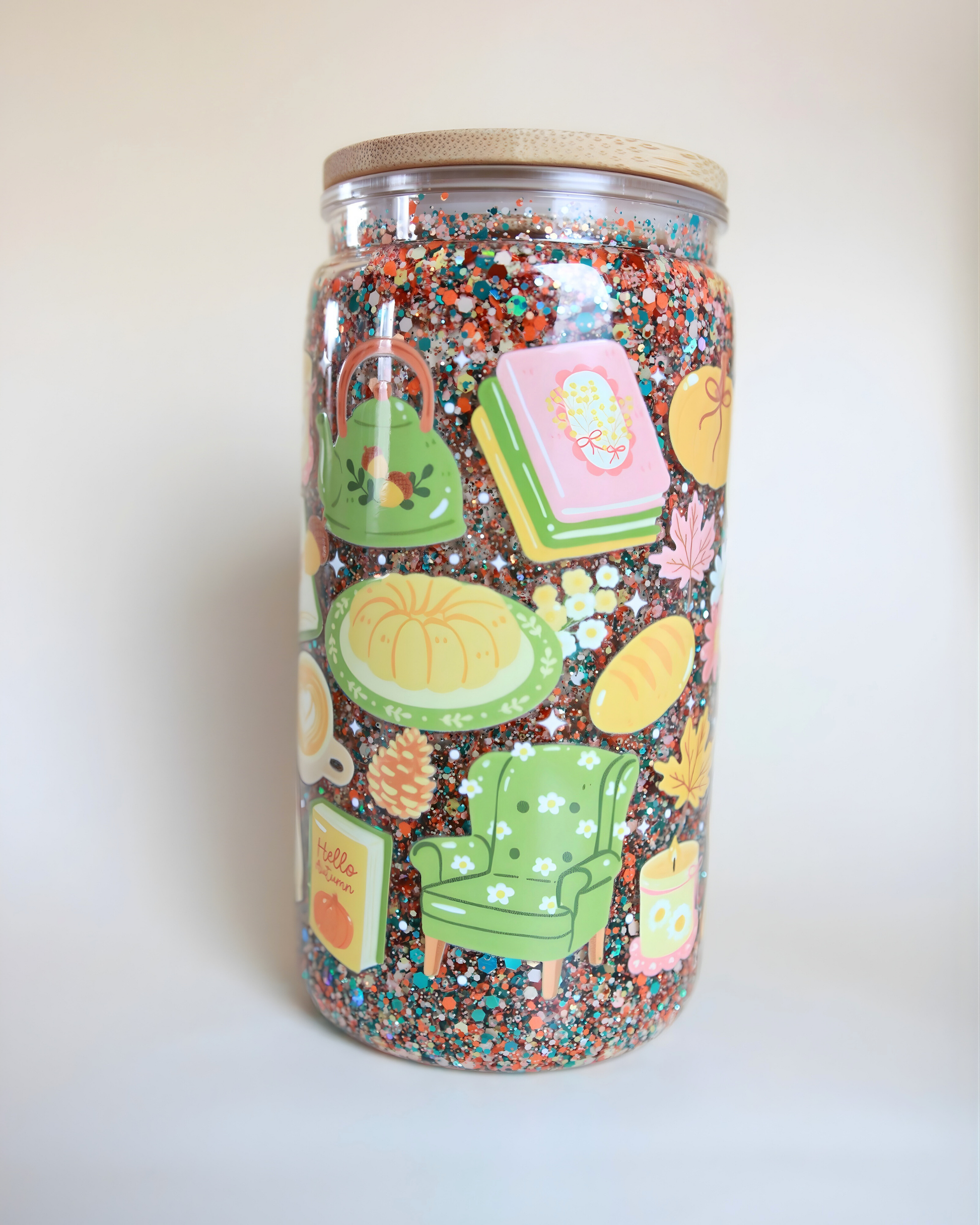 Cozy Chapter 🍂☕️ est une invitation à ralentir et à savourer les petits moments. Avec ses illustrations de chandelles, de tasses fumantes et de feuilles dorées, ce gobelet capture l’essence même des journées d’automne : chaleureuses, paisibles et pleines de réconfort. Le tout sublimé par un tourbillon de paillettes cuivrées et dorées ✨