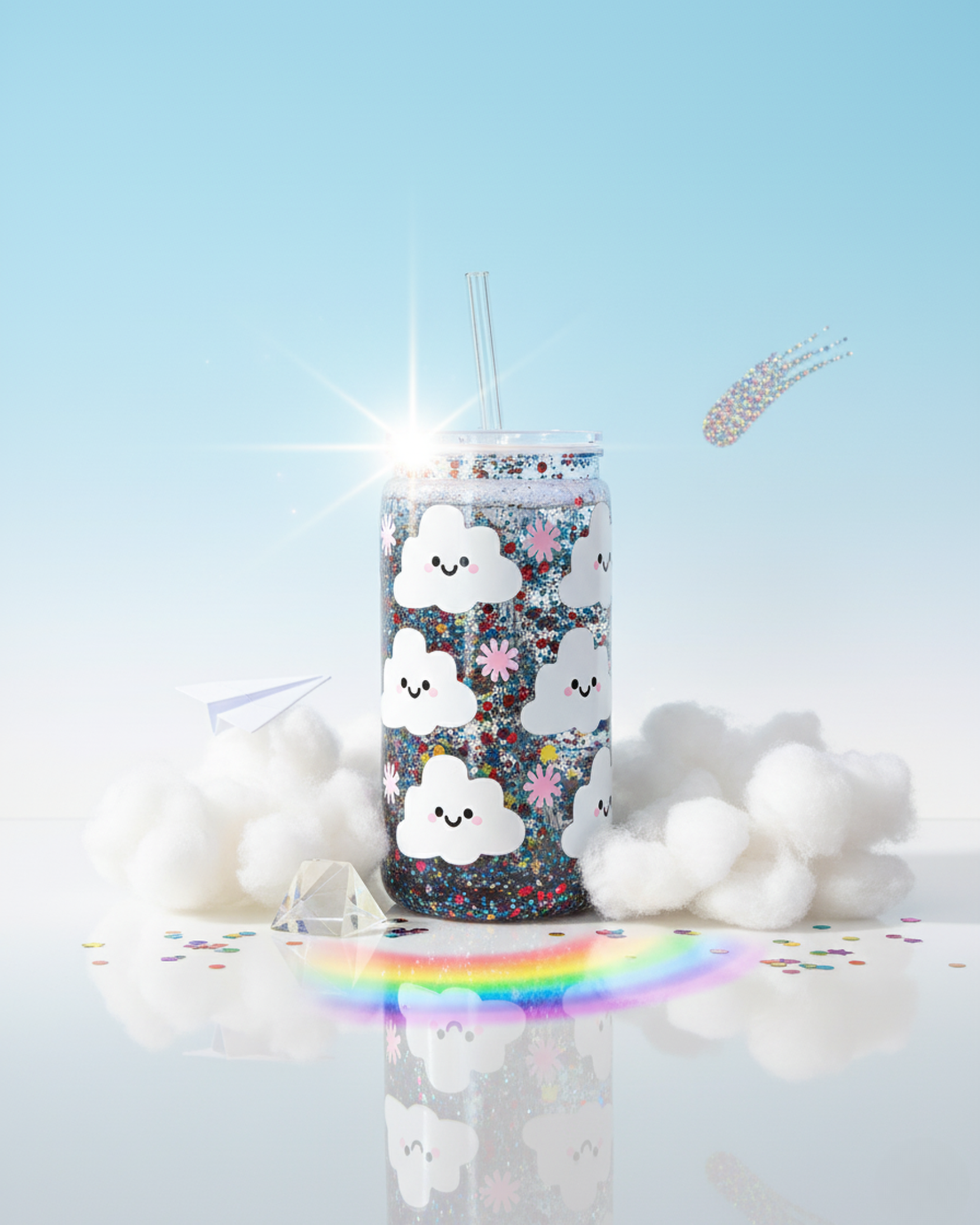 Fluffy Magic, c’est une dose de bonne humeur flottante dans un nuage de paillettes. Avec ses petits nuages souriants et ses reflets arc-en-ciel, ce gobelet est une invitation à garder la tête dans les étoiles et le cœur léger. Un concentré de douceur et de magie pastel pour illuminer ton quotidien, même les jours gris. ☁️🌈