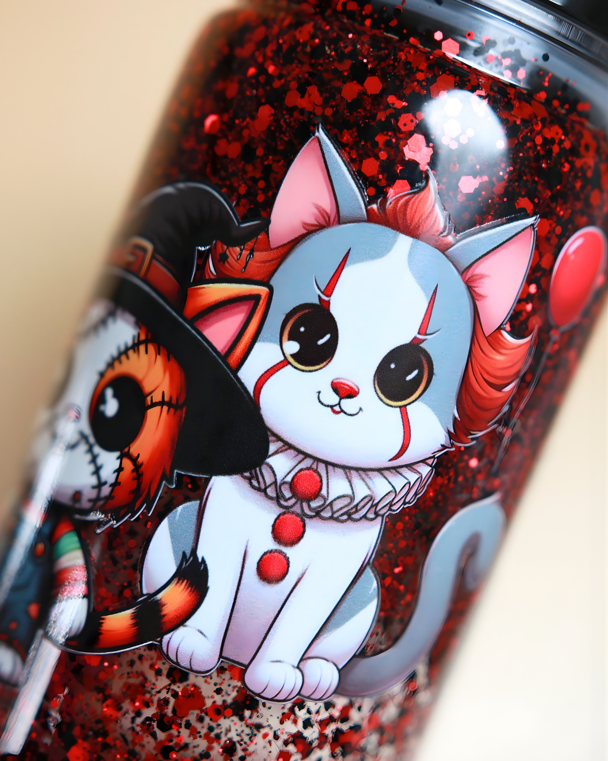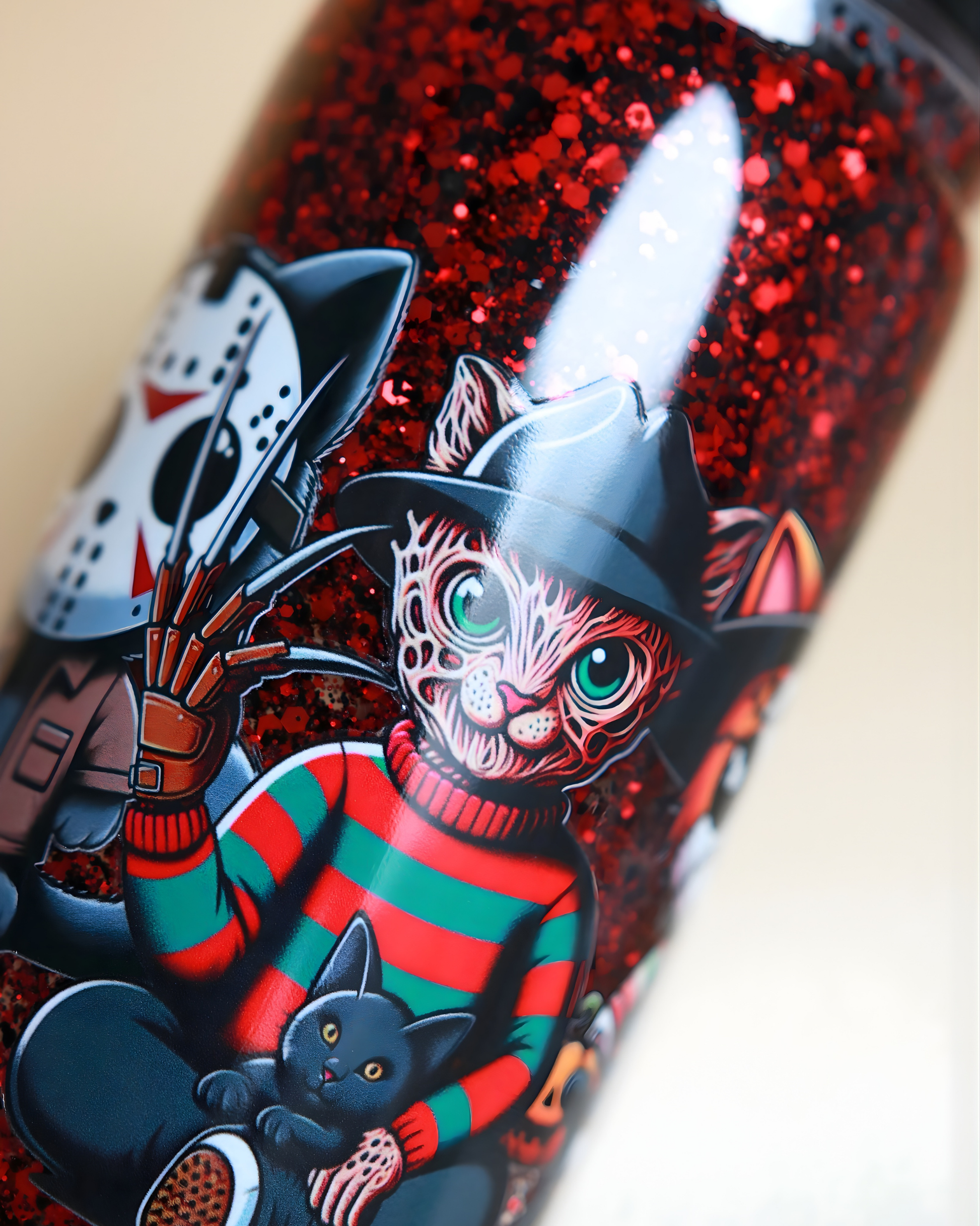 Killer Cuties 💀, c’est l’esprit d’Halloween avec une dose de second degré. Des chats en mode tueurs cultes, un humour noir tout doux, et des paillettes rouges qui dansent comme des confettis de film d’horreur. C’est le gobelet des âmes espiègles : celles qui rient fort, qui n’ont pas peur de leur côté sombre et qui savent que même la peur peut briller un peu. ✨
