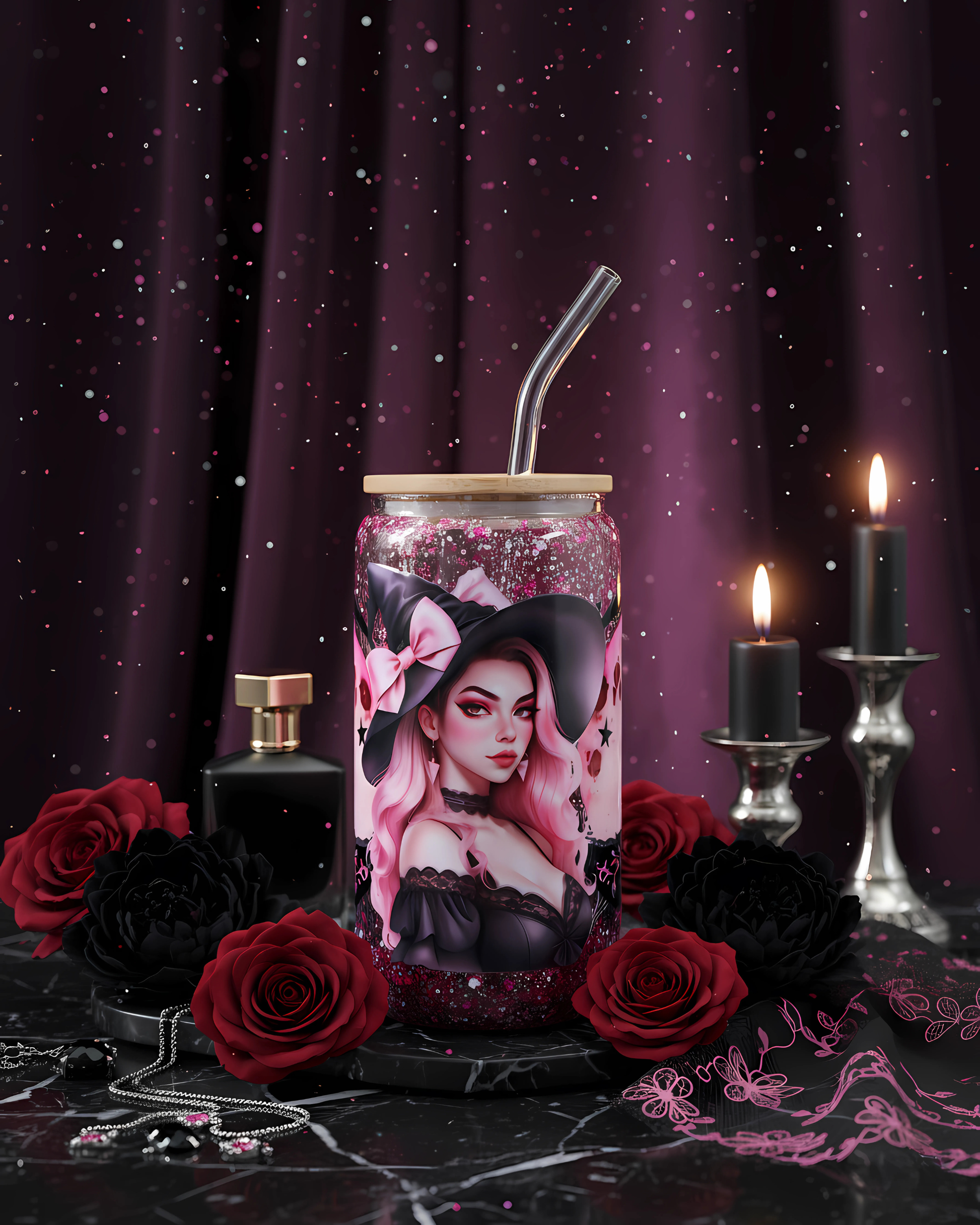 Glamour Witch incarne la sorcière moderne : envoûtante, audacieuse et terriblement chic. Avec ses roses rouges profondes, son aura mystérieuse et ses paillettes hypnotiques, ce gobelet est l’accessoire parfait pour toutes celles qui veulent allier magie et élégance. 🖤🌹