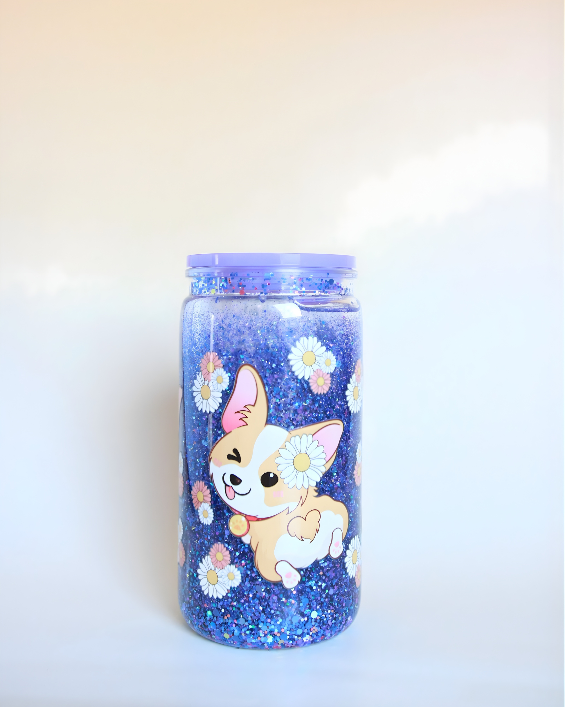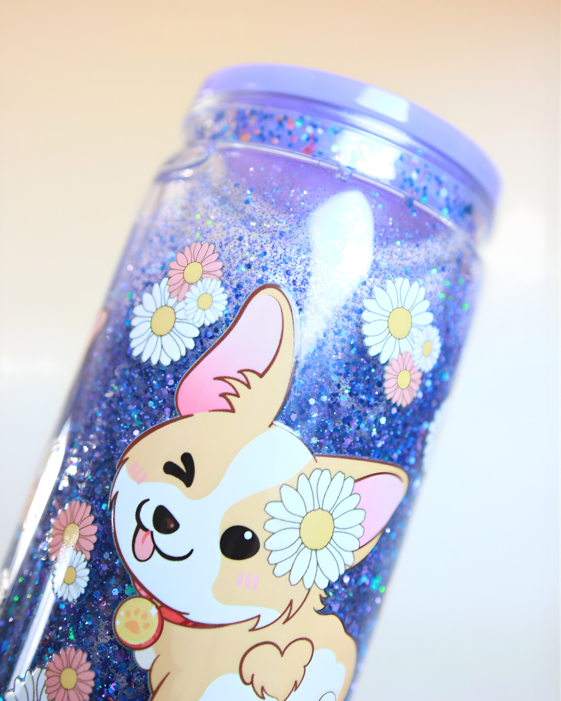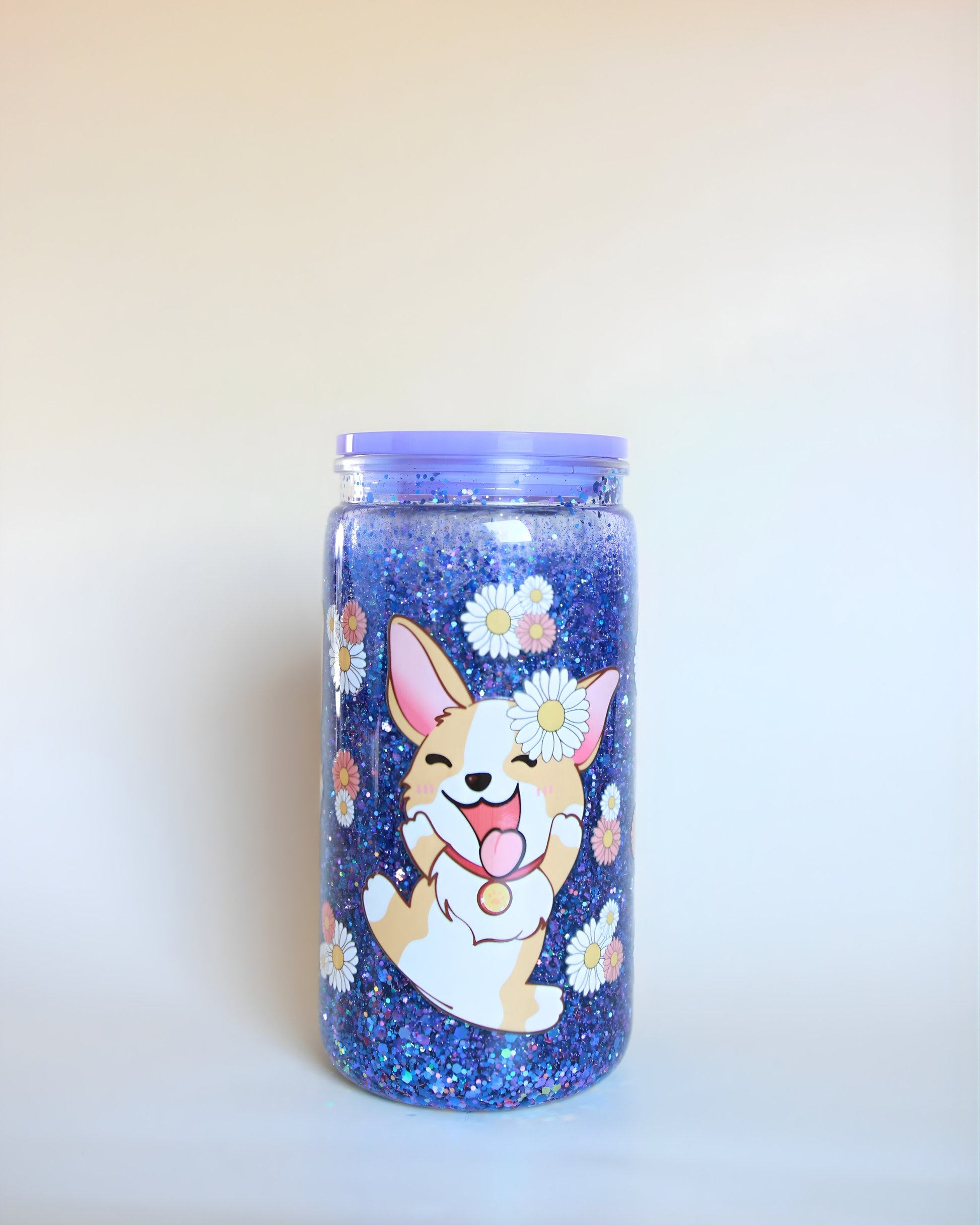 Happy Corgi, c’est l’énergie pure, la mignonnerie absolue et la bonne humeur concentrée dans un gobelet ! Avec ses différentes petites expressions adorables et ses marguerites façon flower field, ce gobelet scintillant est une véritable bouffée d’oxygène. Un compagnon parfait pour illuminer tes pauses boisson et booster ton mood au quotidien. 💜🌼