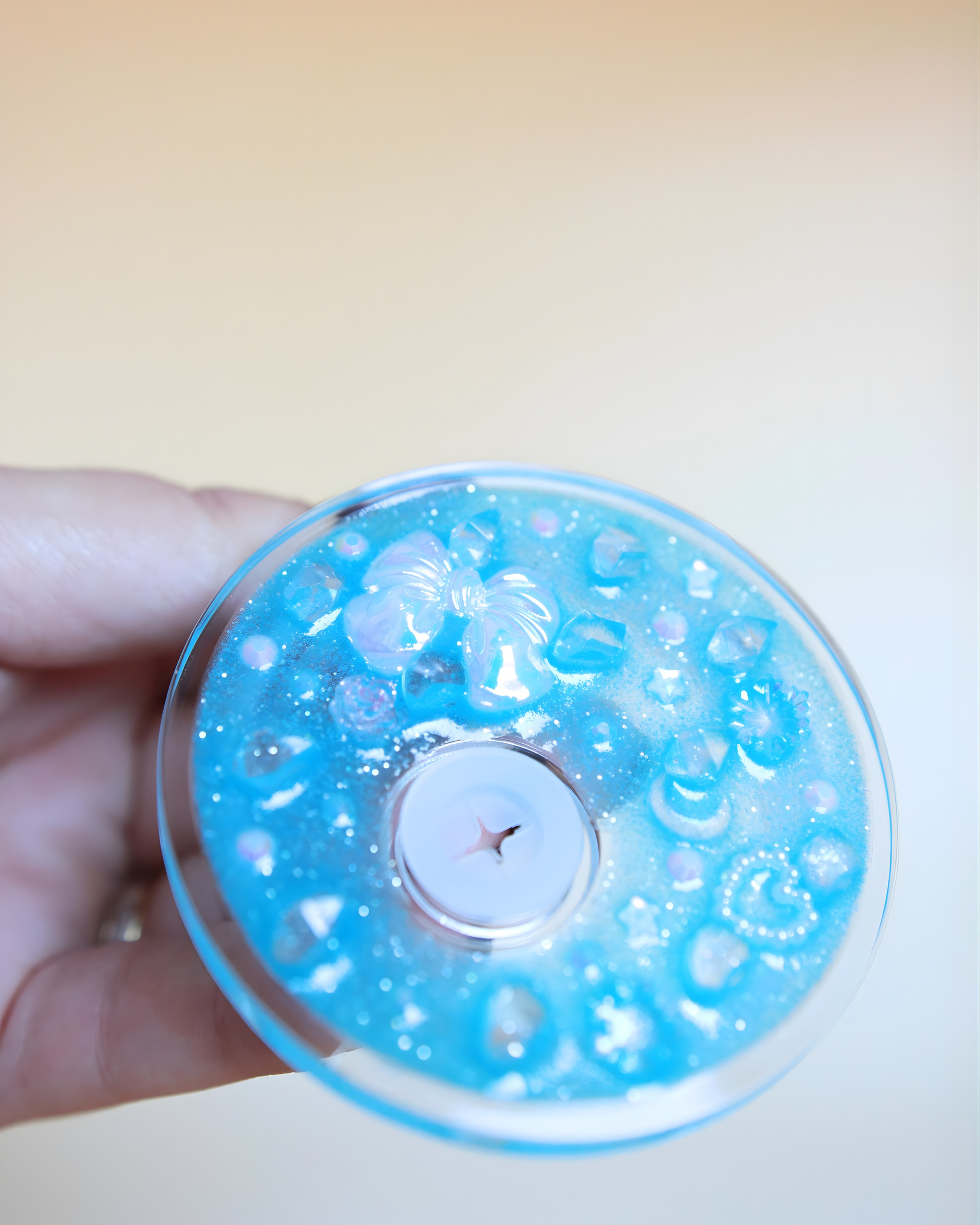 - Couvercle : Décoré à la main en résine pailletée bleue avec strass (non étanche)