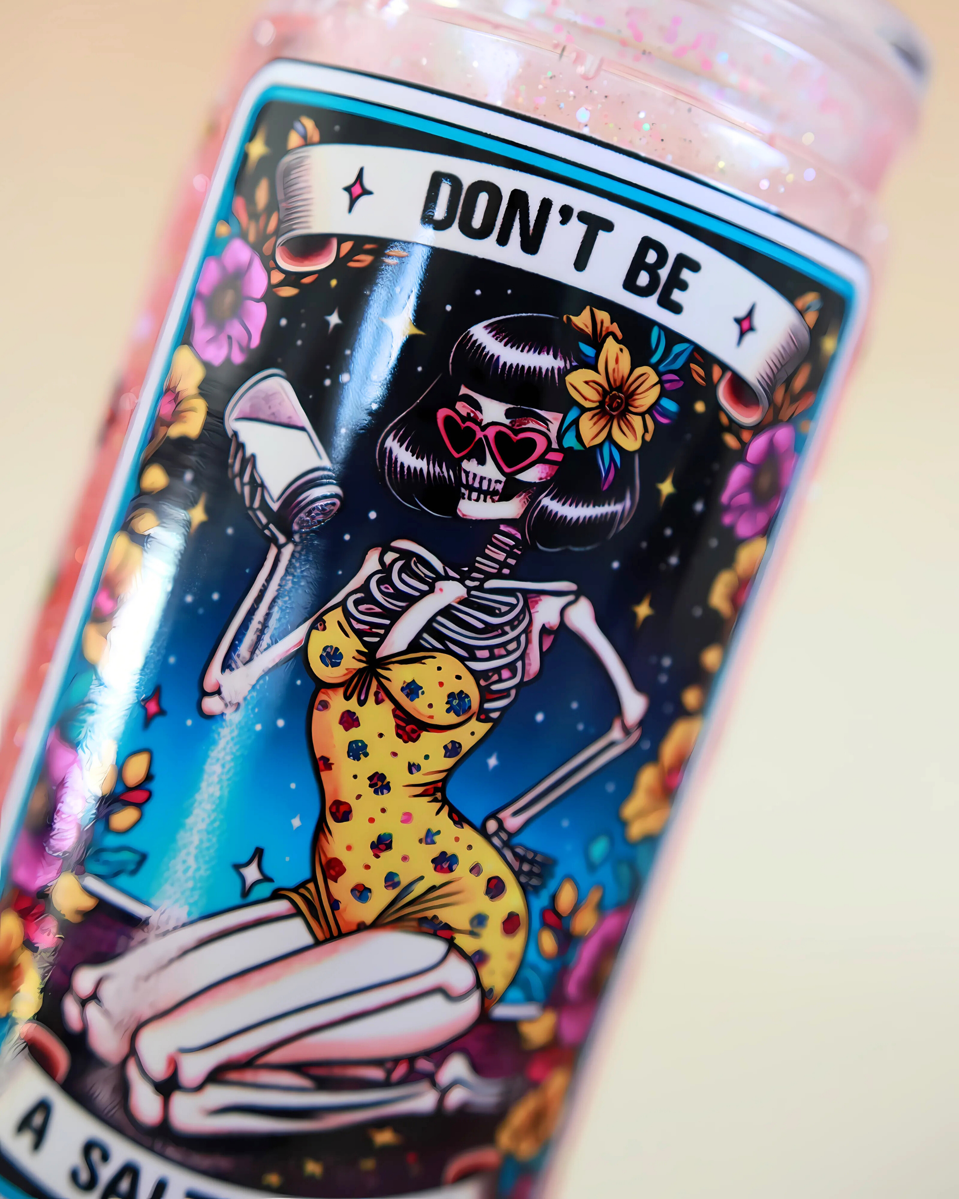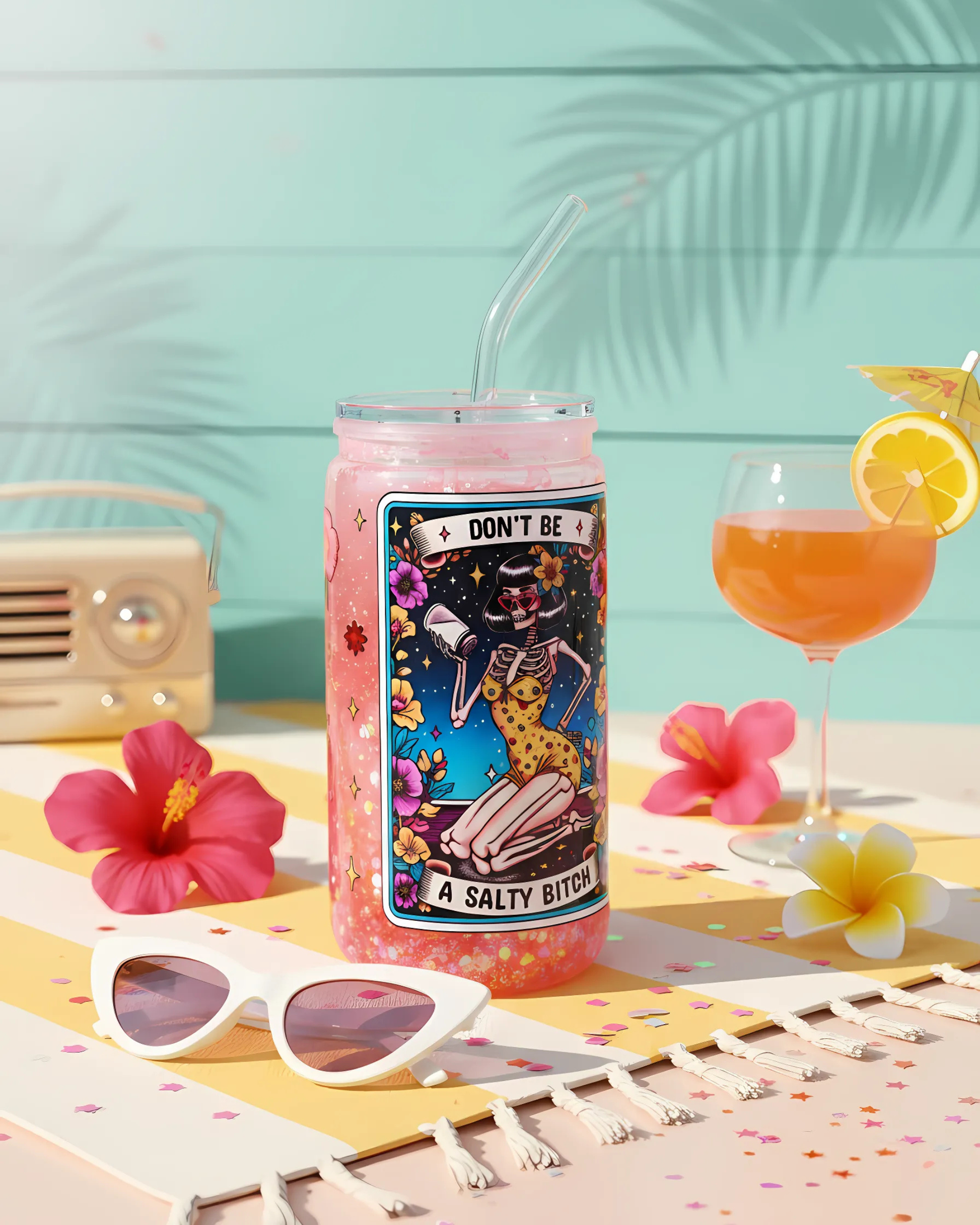 Salty Bitch 🌺 l’allié parfait des esprits libres qui n’ont pas peur de briller et d’assumer leur caractère (même bien trempé). Entre son rose tropical et ses paillettes en mouvement fluide, ce gobelet incarne la confiance, la légèreté et une touche de sarcasme irrésistible. À siroter sans modération sur la plage, en terrasse ou dans ton salon avec style.